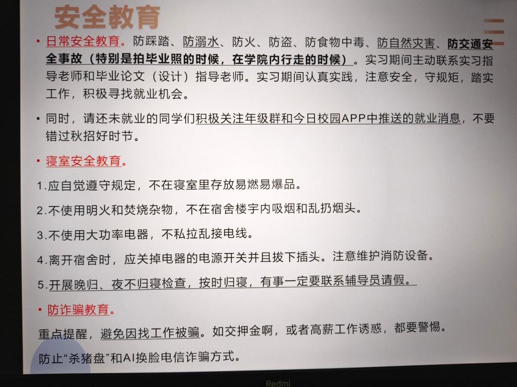 班会中,辅导员结合重庆市教委及学校清明假期安全教育要求,从学生的人身安全、财产安全、交通安全、饮食安全、宿舍安全等多个方面向同学们讲解,强调了假期安全教育的重要性以及需要注意的事项。最后,辅导员们结合各类安全教育视频,多角度向同学们展示了身边存在的安全隐患,再次强调同学们要养成良好的生活行为习惯,严格遵学校各项规章制度,加强安全意识。