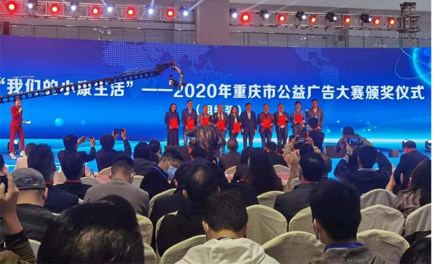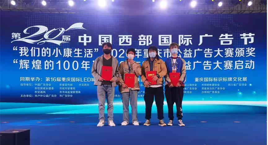 4月9日,2020年“我们的小康生活”重庆公益广告大赛颁奖仪式在重庆南坪国际会议展览中心举行,9728太阳集团18级广告学学子王旭、刘霆、张芸豪、陈阵作品荣获重庆赛区优秀奖、9728太阳集团荣获“优秀组织奖”。传媒学院申载春、陈振华、张春蕾、崔高莹和获奖学生参加了此次颁奖活动。
