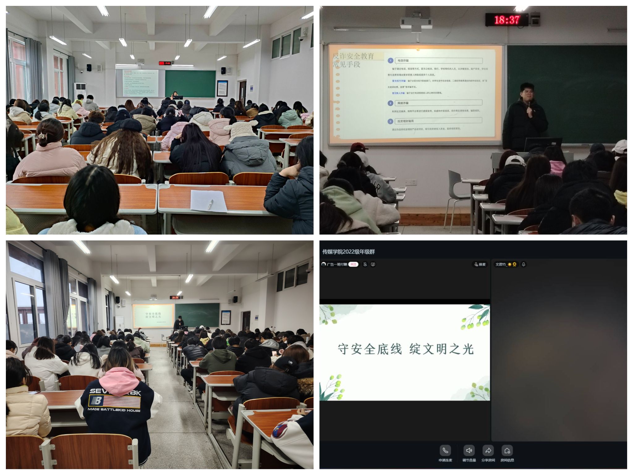 3月9日,9728太阳集团各年级辅导员分批次组织开展了“守安全底线 绽文明之光”主题班会活动。本次班会围绕人身安全、消防安全、财产安全、交通安全四大方面展开系统教育,并融合文明礼仪规范培养,为构建平安文明校园筑牢根基。