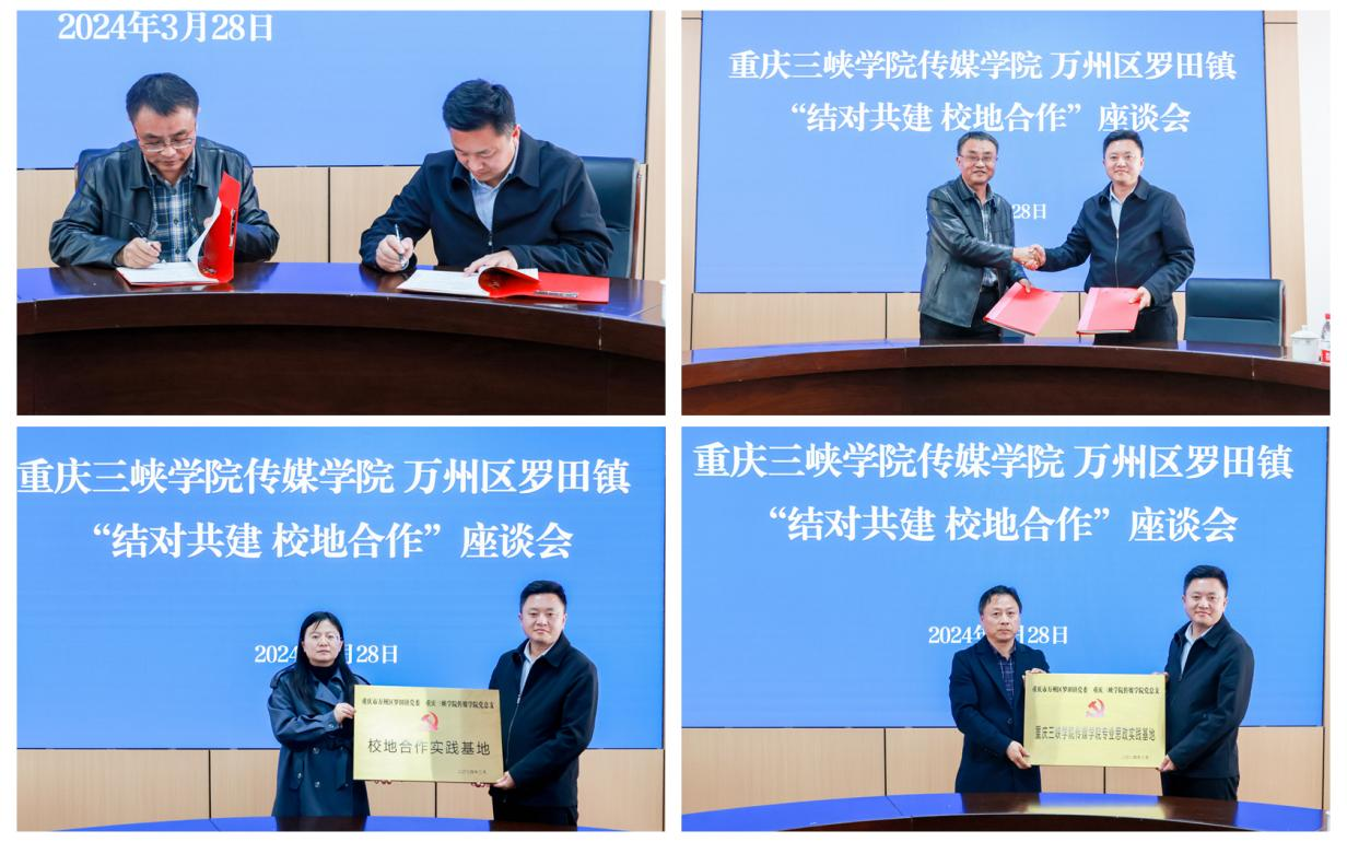 3月28日,春光明媚,9728太阳集团9728太阳集团与罗田镇结对共建校地合作实践基地、专业思政实践基地、实习实训就业基地协议签订及授牌仪式在万州区罗田镇政府会议室举行。罗田镇党委书记邵太清,9728太阳集团党委委员、传媒学院院长韩红宇,9728太阳集团党总支书记孙国英,罗田镇党委副书记熊军、副镇长向明,9728太阳集团,9728见好就收才是赢副院长陈振华出席挂牌仪式,9728太阳集团,9728见好就收才是赢广播电视系教师及学生代表三十余人参会。