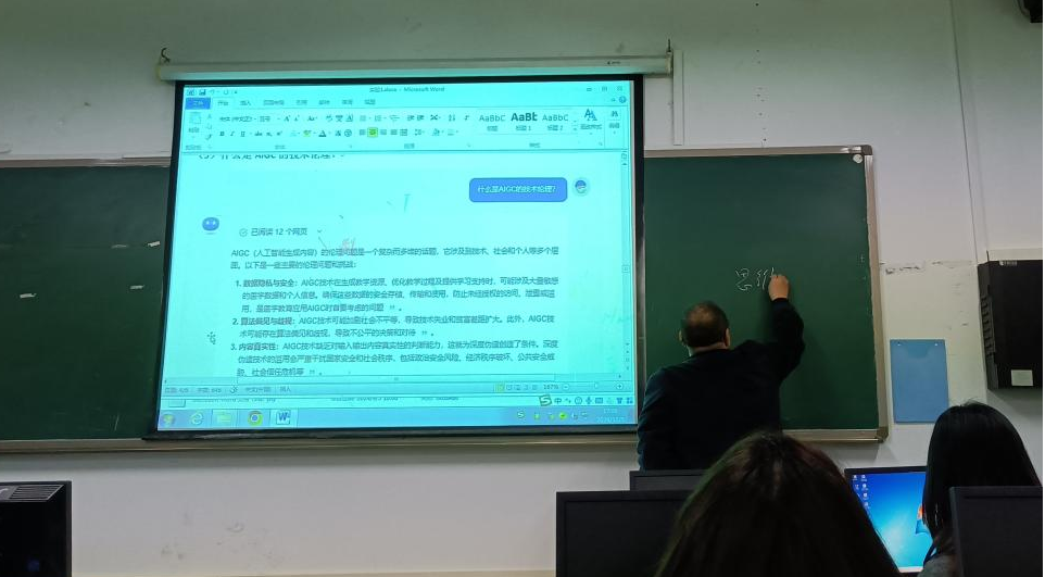 步入正题后,余老师以 “人类的四次自我认知革命” 为切入点,不断抛出问题与同学们积极互动,引导大家思考。在依次阐述了前三次自我认知革命后,引出本次课程的核心——第四次自我认知革命 “生成式 AI”。余老师借助手机上的AI工具“智谱清言”和“Kimi”,引导同学们输入诸如“什么是提示工程?”“什么是数字素养?”“国内大模型的发展现状”等指令,让同学们在实践操作中亲身体验生成式AI的魅力,有效增强了课程的趣味性与实用性,使大家在理论与实践的交融中深入理解并学会应用AI工具。课堂上,同学们热情高涨,纷纷按照余老师的指导,积极使用 AI 工具进行学习与探索,现场学习氛围浓厚。