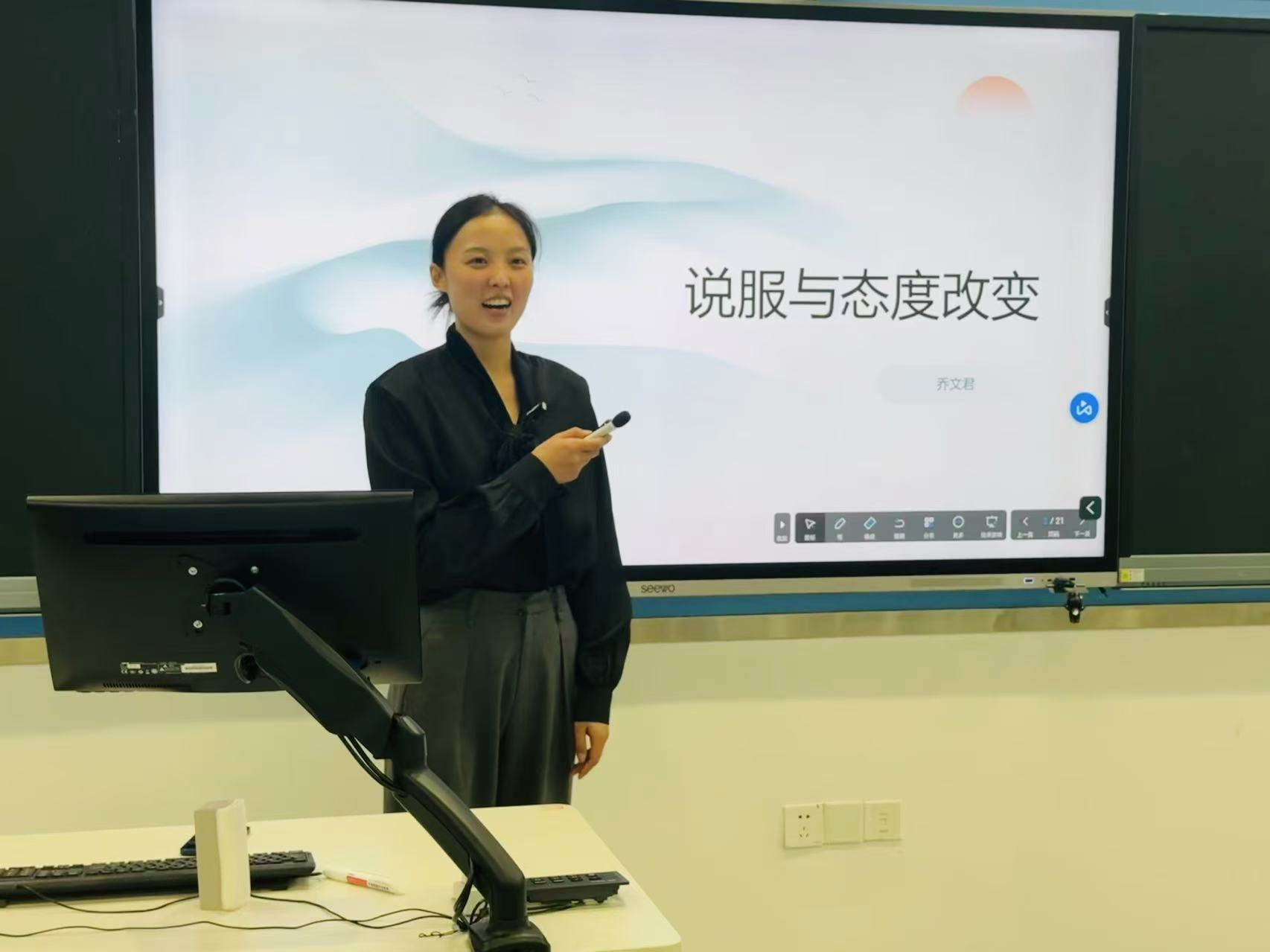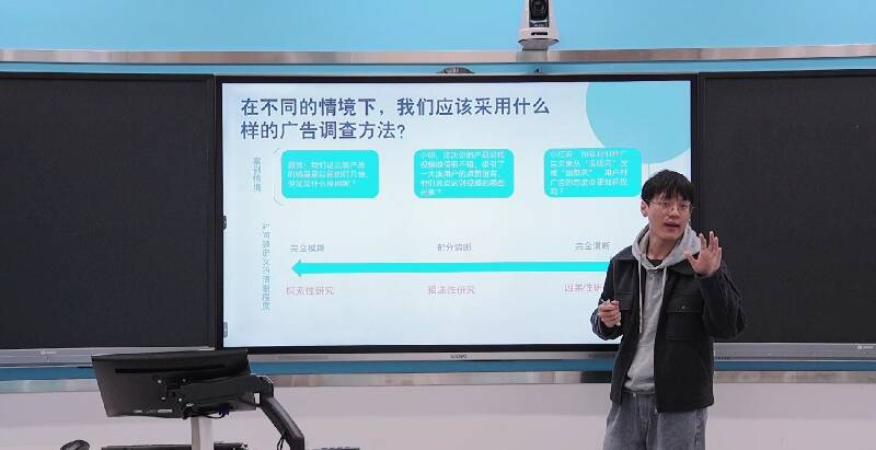 学院青年教师刘宁、李佳蓉、崔高莹、黄文波、乔文君、张春蕾围绕课程思政建设与课程创新思路,分别聚焦短视频新闻、经典广告案例、人工智能海报制作、广告调查方法、说服与态度改变等章节进行现场课堂教学演示。评委对参赛选手的教学创新成果报告、课堂教学进行全面细致的评审,并就课程内容改革、教学方法创新、教学环境创设等提出建议。