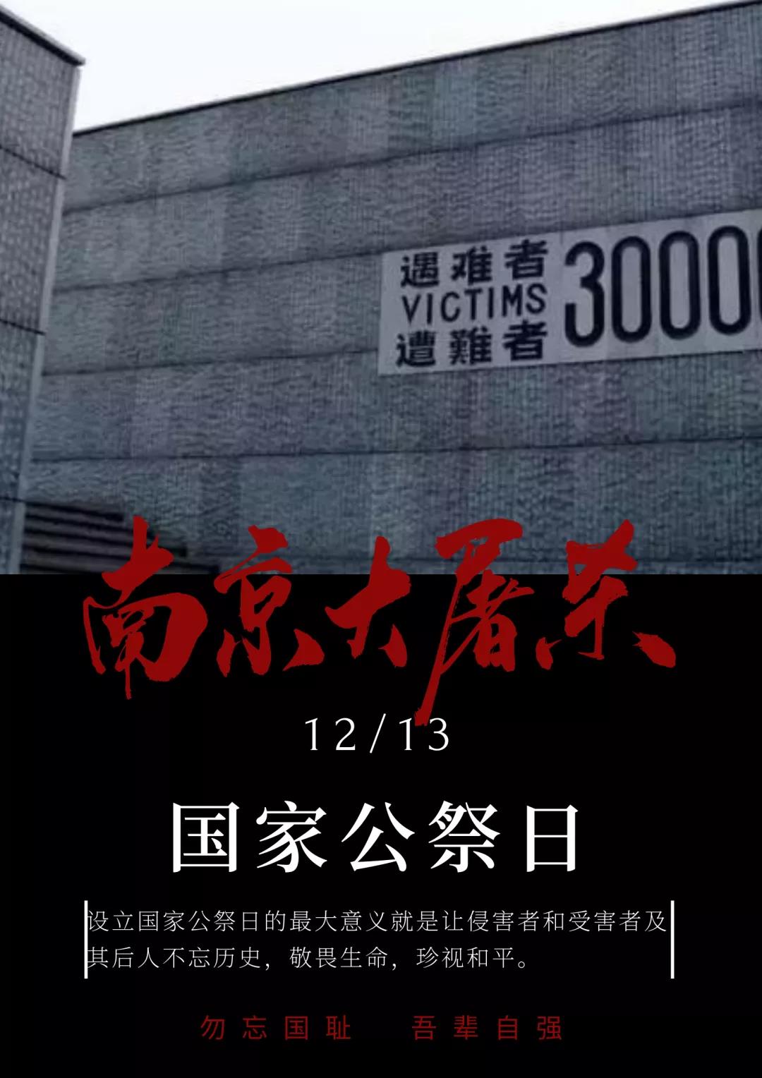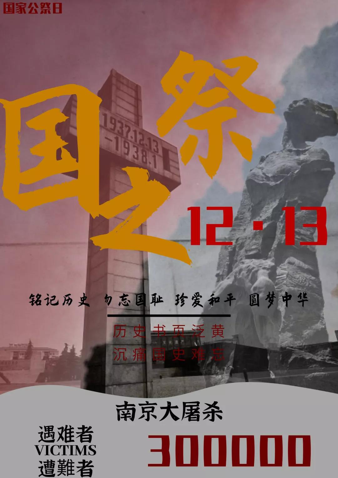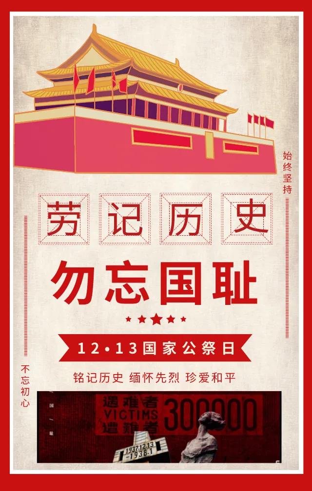 83年的今天,南京被攻陷,在此后的一个多月,血腥屠杀30余万中国人,制造了震惊中外的南京大屠杀事件。其滔天罪行,罄竹难书。今天,12月13日,是第七个“国家公祭日“,民族之殇,祭之以国,勿忘,勿忘!9728太阳集团铭记历史,珍爱和平,由团总支学生会各部门设计国家公祭日主题海报,哀悼逝者,不为延续仇恨,只为警醒,牢记历史,守望和平,吾辈当自强。
