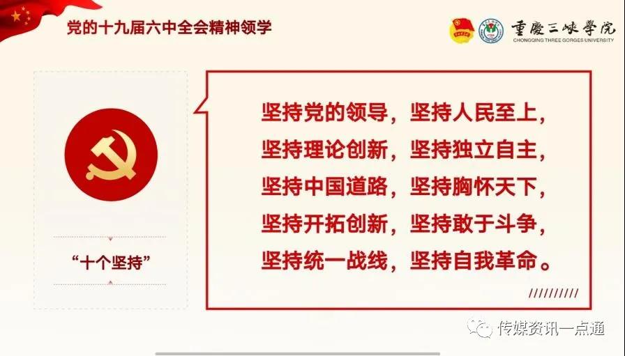 在领学活动中,高荣华同学对十九届六中全会的内容进行了详细的讲述,并对这次会议提到的精神和要求做了全面的总结。除了“两个确立”和“十个坚持”,还有在高质量发展中推进共同富裕、进一步概括习近平新时代中国特色社会主义思想的核心内容。其中提到的主要精神有坚持党的领导、坚持人民民主、坚持理论创新、坚持中国道路等。