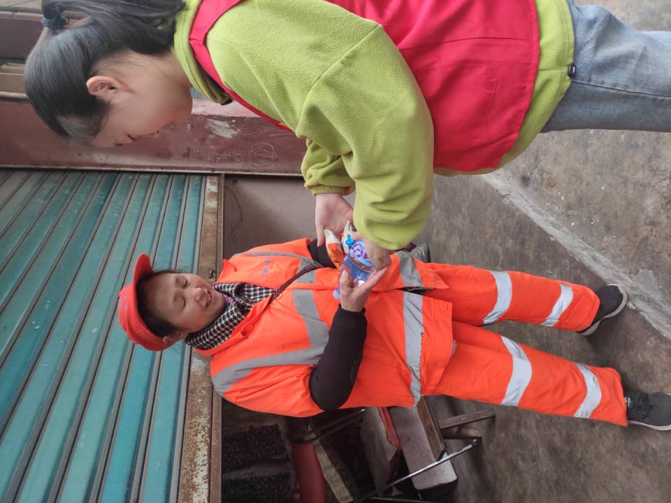 等到环卫工人中途休息时,同学们给他们递上了水和零食,帮助他们补充体力。阿姨们看着手上的水,十分感谢。稍作休息后,大家又开始打扫街道,帮助环卫工人完成了今天的工作。