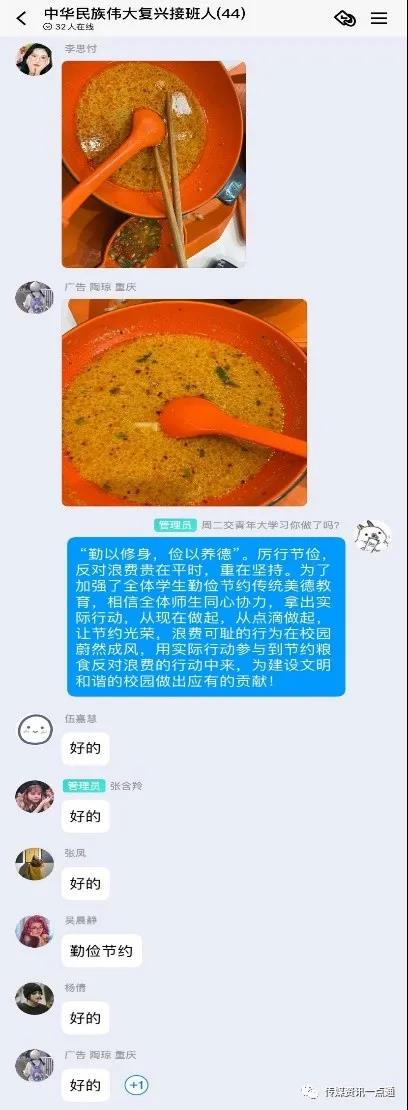 拒绝“舌尖上的浪费”识“食物”者为俊杰。为响应党中央提出“厉行节约,反对浪费”,建设节约型社会的号召。9月7号上午9728太阳集团各班分别在线上线下开展了“厉行节约,反对浪费”主题班会。